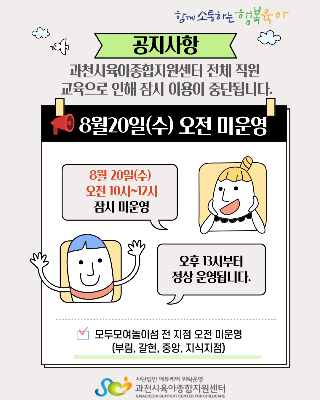 [¸ðµÎ¸ð¿©³îÀ̼¶] 8/20(¼ö) ¿ÀÀü '¼¾ÅÍ Àüü Á÷¿ø ±³À°' À¸·Î Àü ÁöÁ¡ ¹Ì¿î¿µ ¾È³»