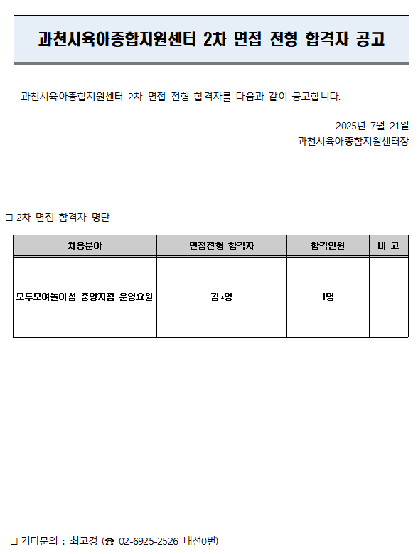 [°úõ½ÃÀ°¾ÆÁ¾ÇÕÁö¿ø¼¾ÅÍ] Á÷¿øÃ¤¿ë 2Â÷ ¸éÁ¢ÀüÇü ÇÕ°ÝÀÚ °ø°í