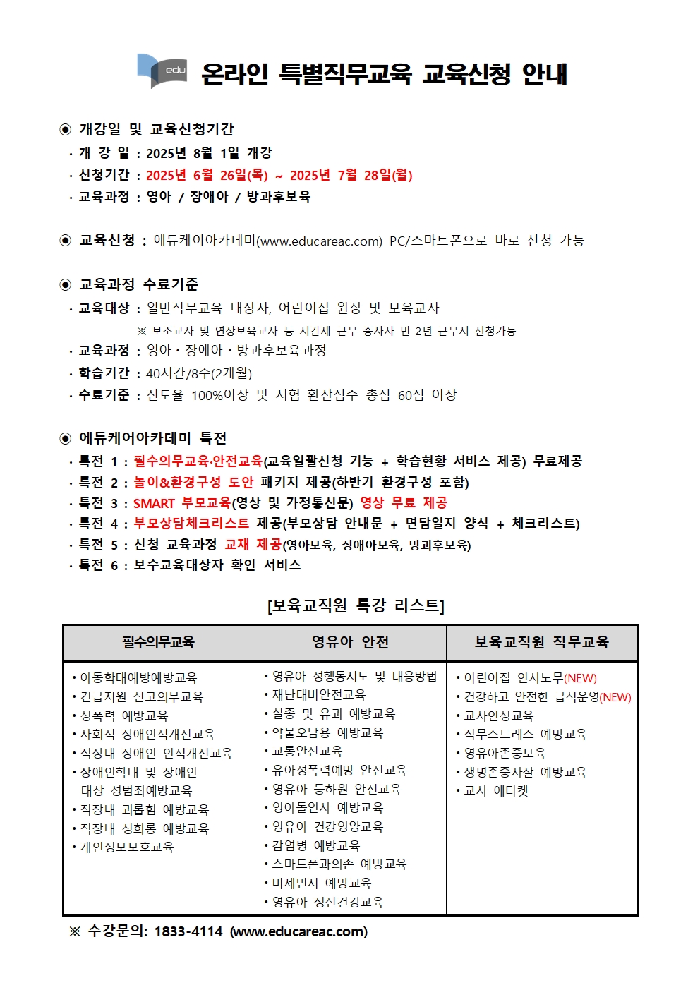 [¿¡µàÄÉ¾î¾ÆÄ«µ¥¹Ì] º¸À°±³Á÷¿ø ¿Â¶óÀΠƯº°Á÷¹«±³À° 2025³â8¿ù °³° ±³À°½Åû ¾È³»