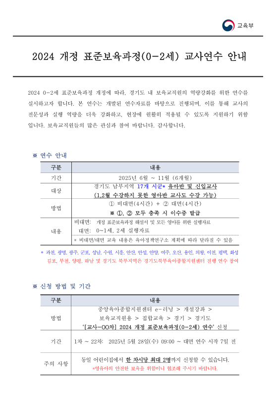 [°æ±âµµÀ°¾ÆÁ¾ÇÕÁö¿ø¼¾ÅÍ] 2024 °³Á¤ Ç¥Áغ¸À°°úÁ¤(0~2¼¼) ±³»ç¿¬¼ö ¾È³»