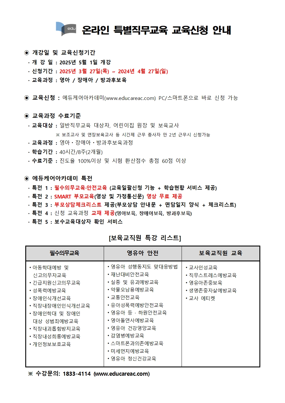 [¿¡µàÄÉ¾î¾ÆÄ«µ¥¹Ì] º¸À°±³Á÷¿ø ¿Â¶óÀΠƯº°Á÷¹«±³À° 2025³â 5¿ù °³° ±³À°½Åû ¾È³»