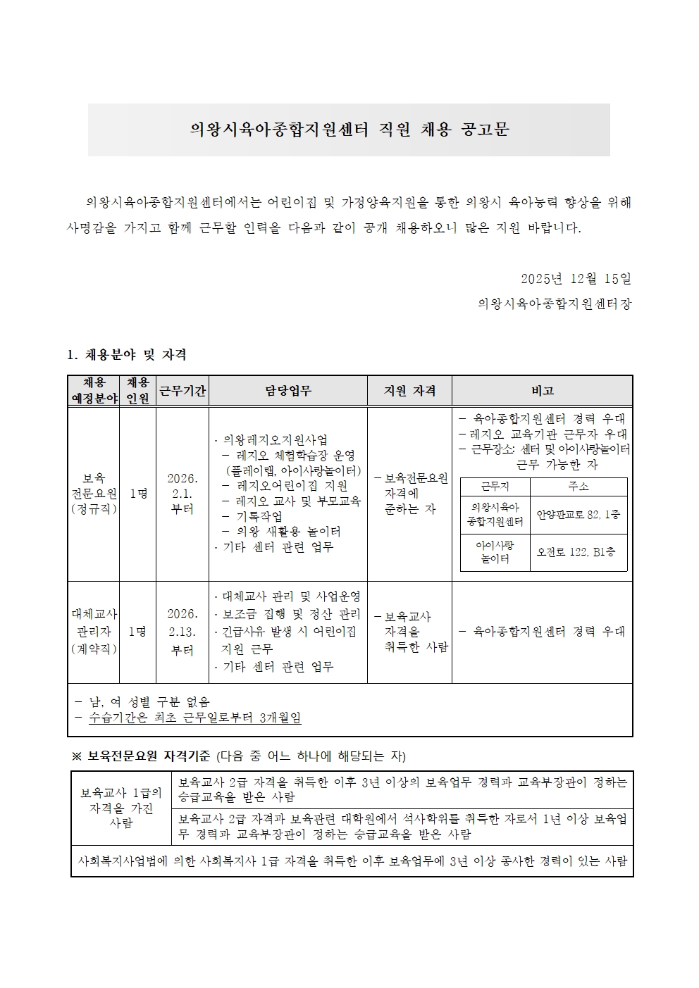 [ÀǿսÃÀ°¾ÆÁ¾ÇÕÁö¿ø¼¾ÅÍ] Àǿռ¾ÅÍ Á÷¿ø(º¸À°Àü¹®¿ä¿ø, ´ëü±³»ç °ü¸®ÀÚ) ä¿ë¿¡ µû¸¥ ȨÆäÀÌÁö °ø°í