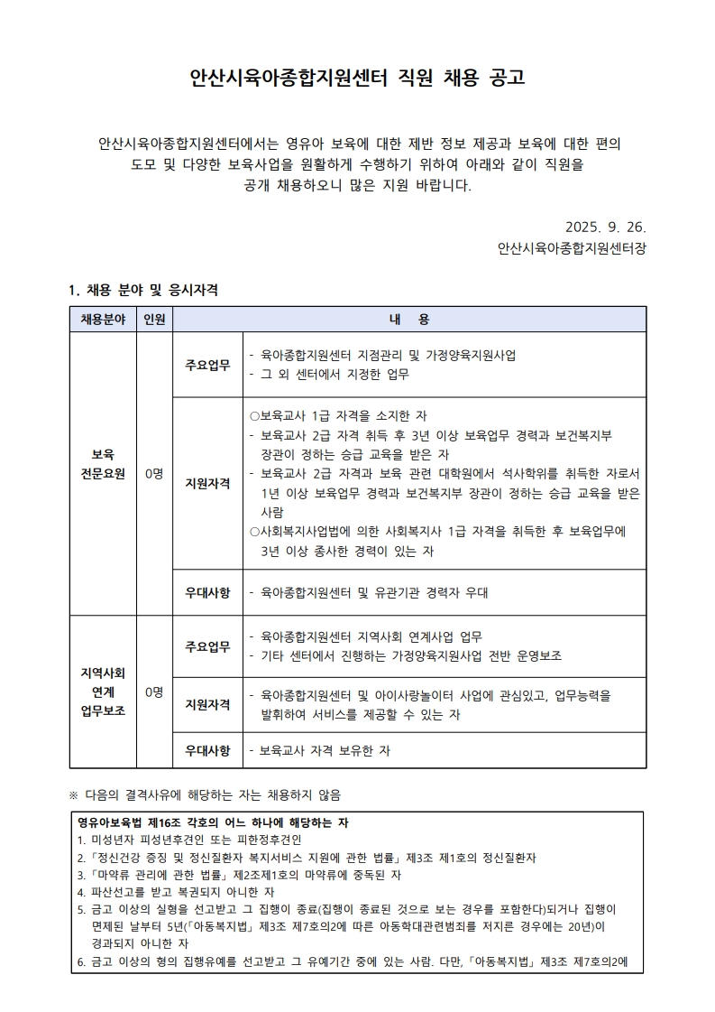 [¾È»ê½ÃÀ°¾ÆÁ¾ÇÕÁö¿ø¼¾ÅÍ] Á÷¿ø(º¸À°Àü¹®¿ä¿ø, Áö¿ª»çȸ¿¬°èüÇèó ¿î¿µº¸Á¶) ä¿ë°ø°í