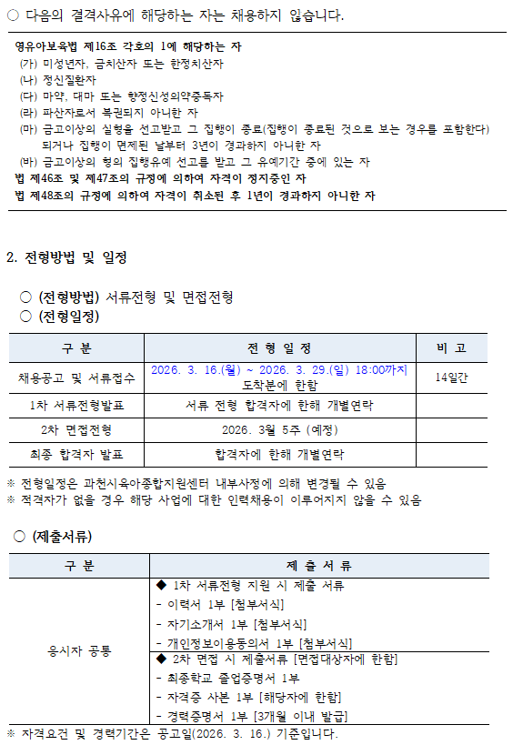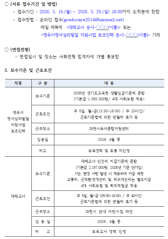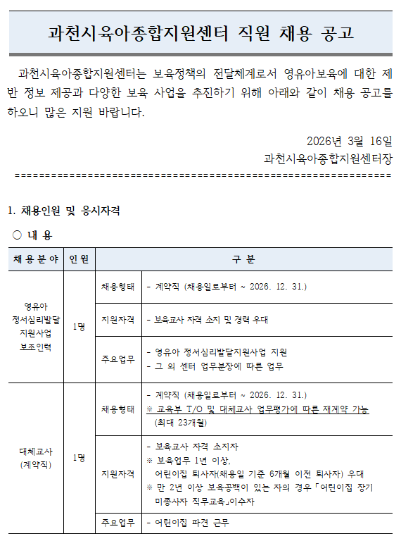 [과천시육아종합지원센터] 직원채용(영유아정서심리발달사업 보조인력, 대체교사) 공고의 건
