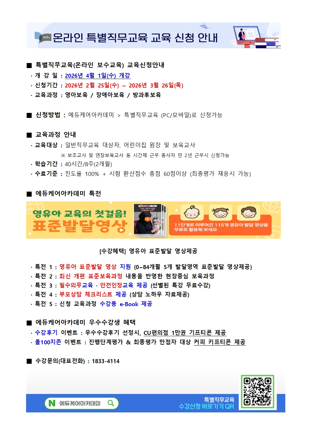 [에듀케어아카데미] 보육교직원 온라인 특별직무교육 2026년 4월 개강 교육신청안내