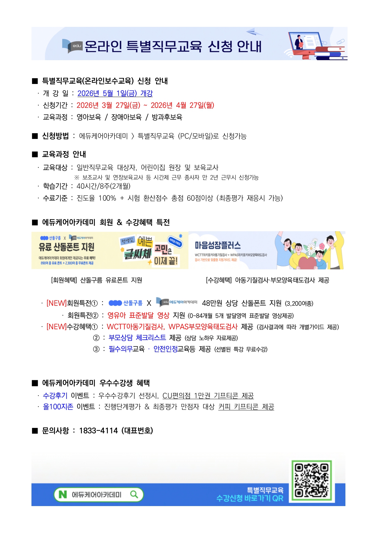 [에듀케어아카데미] 보육교직원 온라인 특별직무교육 2026년 5월 개강 교육신청안내