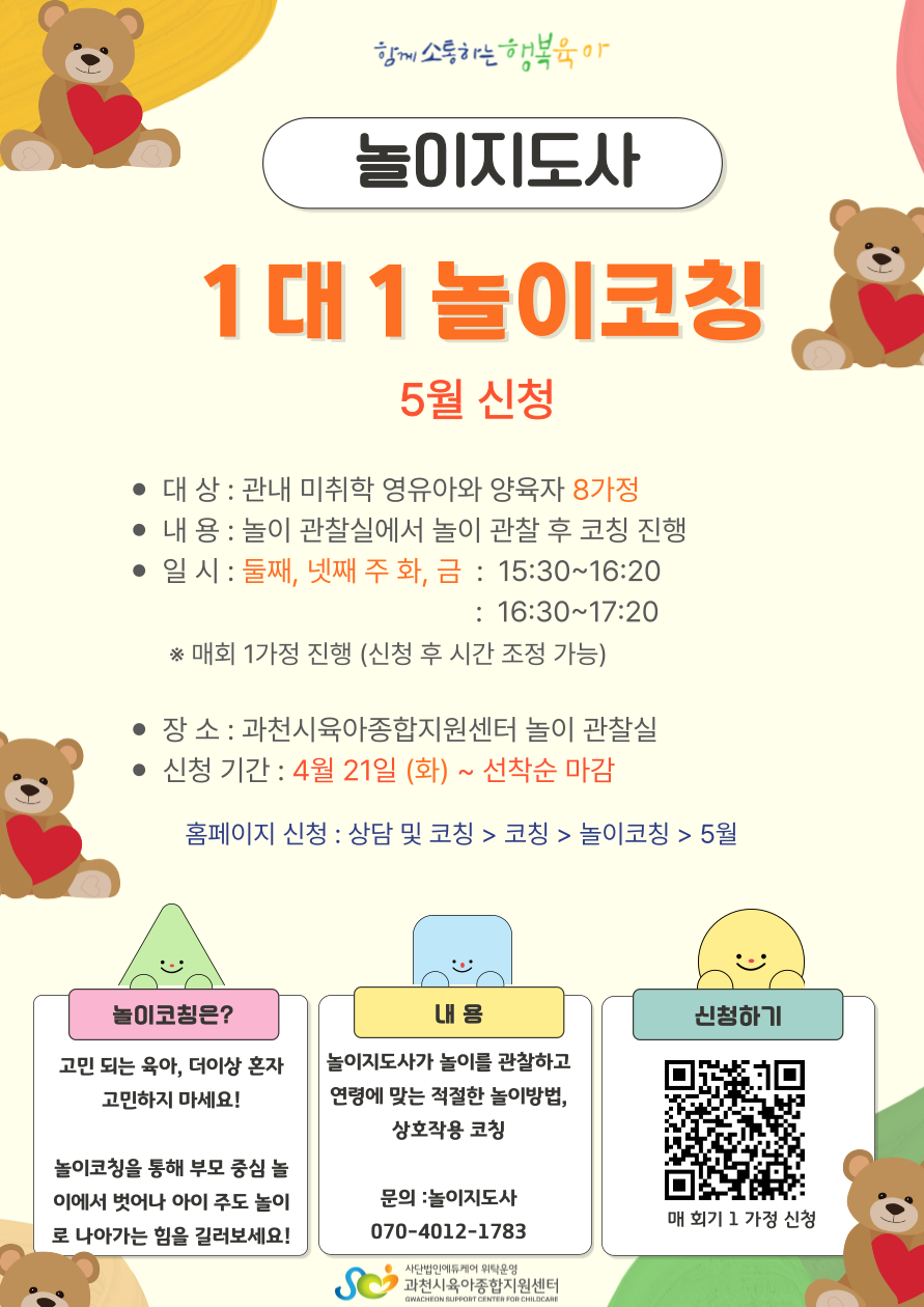 놀이지도사가 부모와 자녀의 놀이 관찰을 바탕으로 상호작용과 연령에 맞는 놀이 방법을 코칭 해 드립니다.