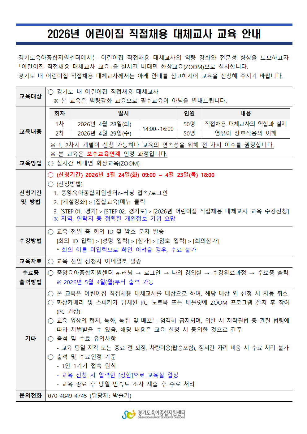 (경기도육아종합지원센터) 2026년 어린이집 직접채용 대체교사 교육