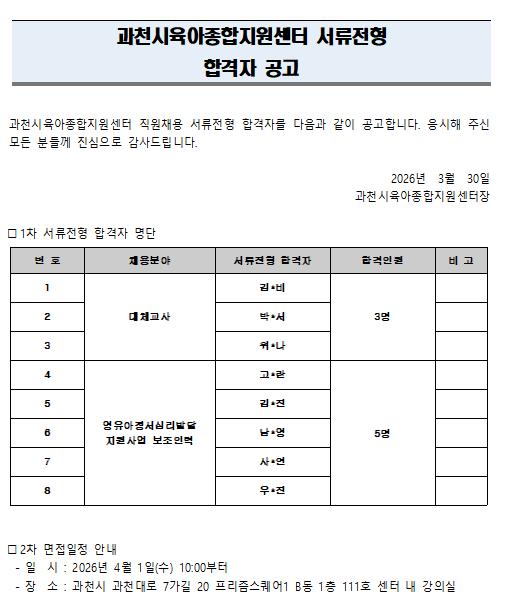 [과천시육아종합지원센터] 서류전형 합격자 공고(대체교사,영유아정서심리발달지원사업 보조인력)