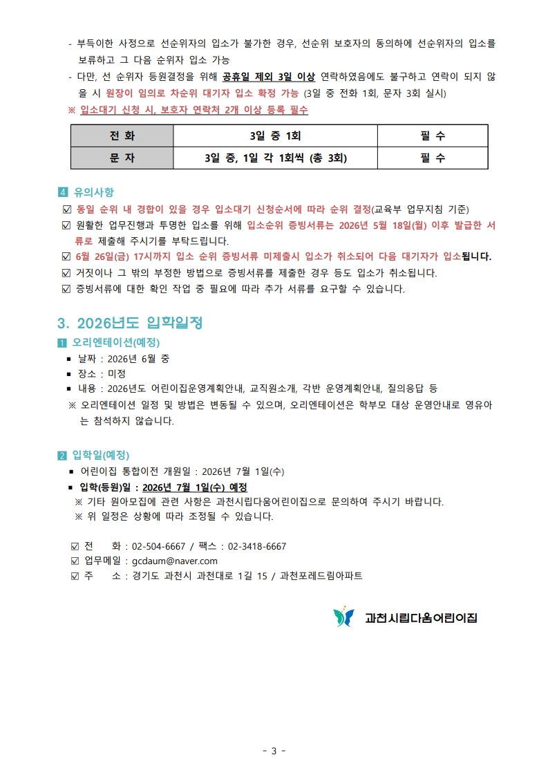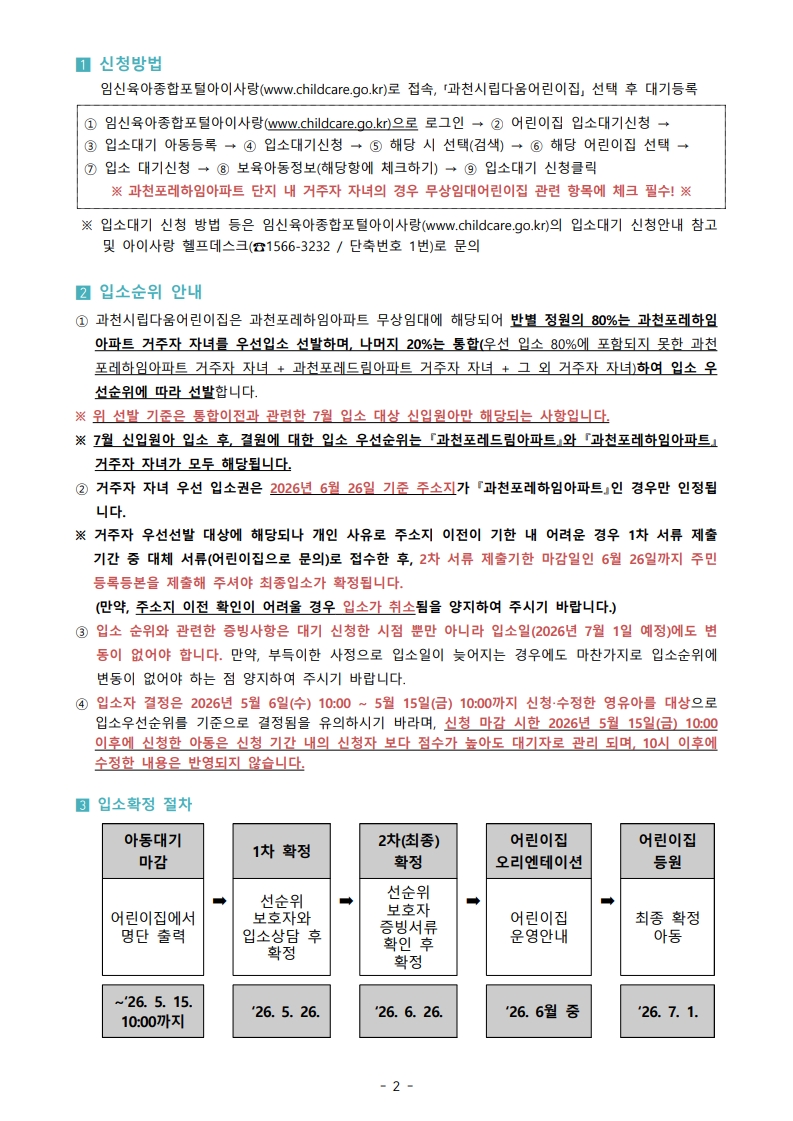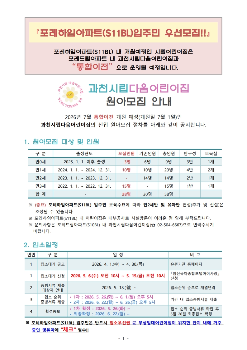 과천시립 다움어린이집 원아모집 안내