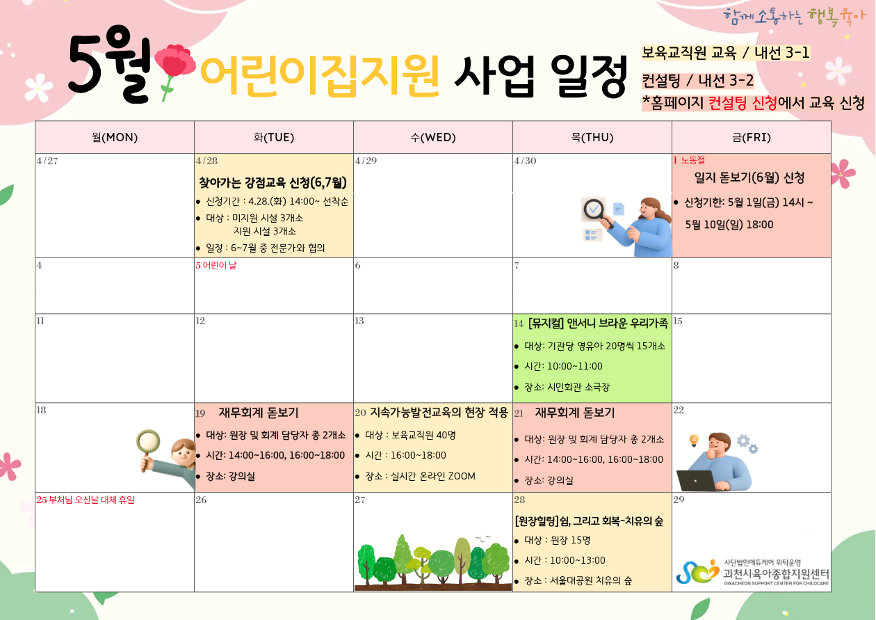 5월에 진행되는 보육교직원 교육과 컨설팅을 안내드립니다.