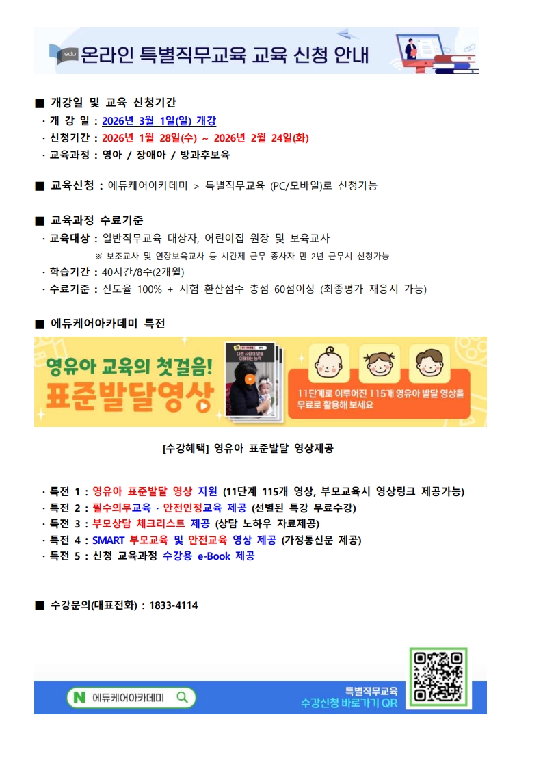 [에듀케어아카데미] 보육교직원 온라인 특별직무교육 2026년 3월 개강 교육신청안내