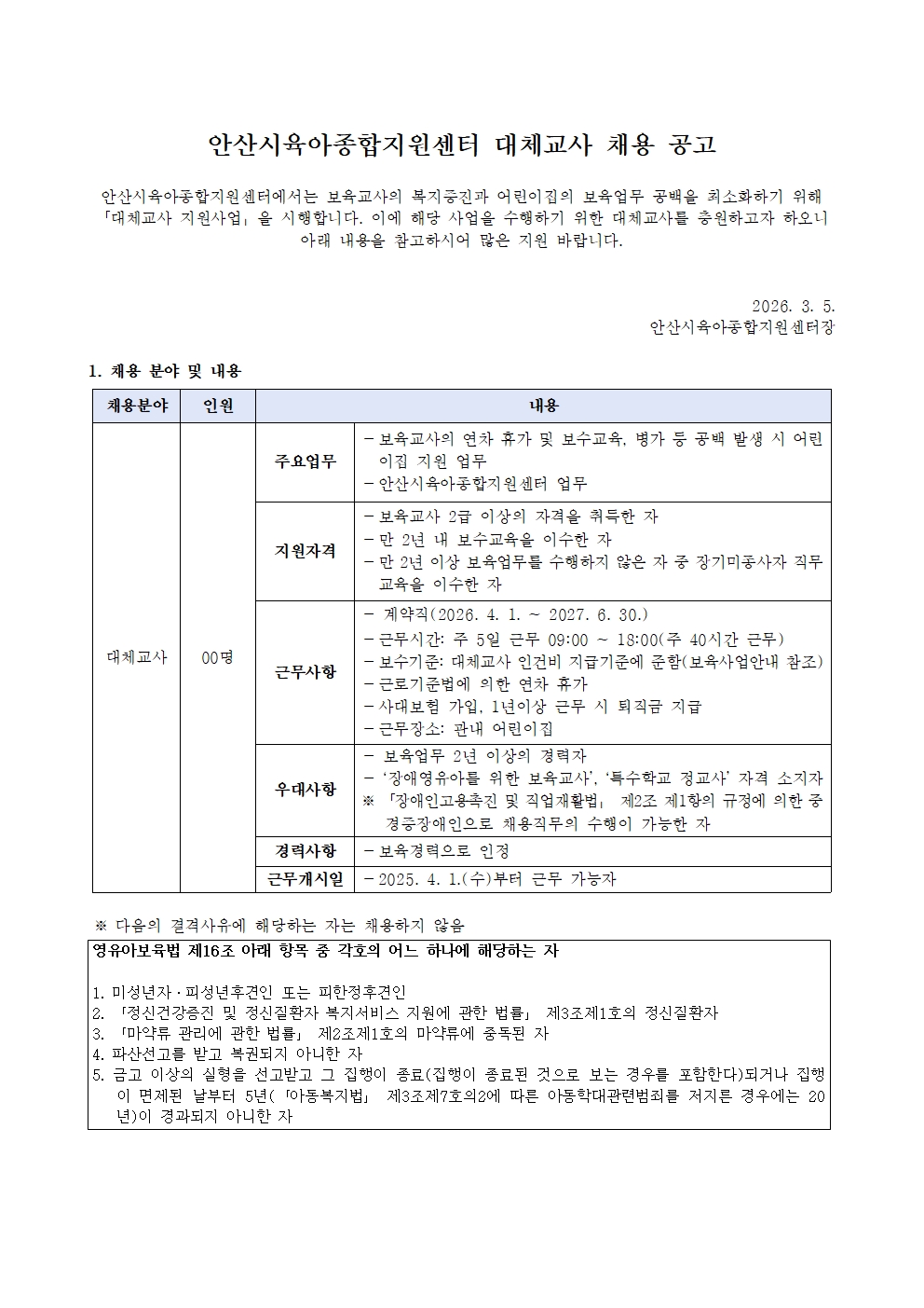 [안산시육아종합지원센터] 직원(대체교사) 채용 공고