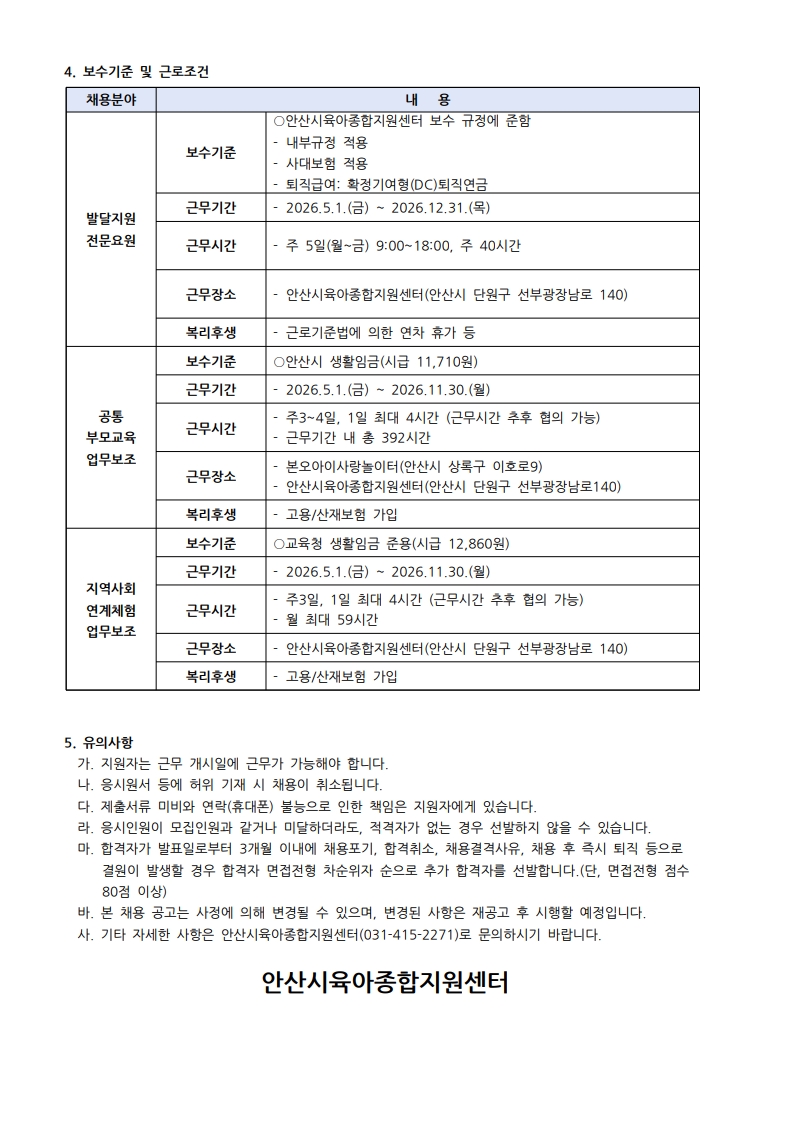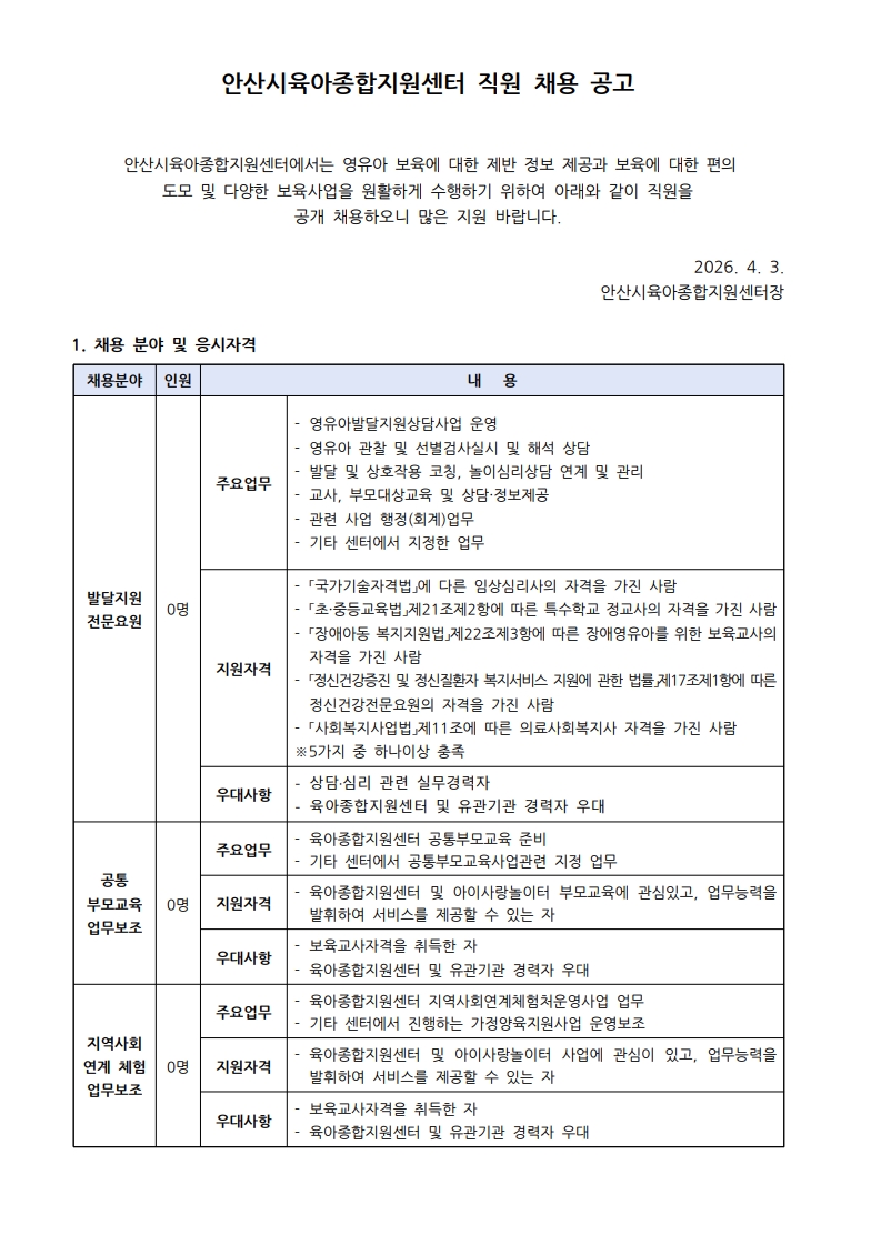 [안산시육아종합지원센터] 직원(발달지원전문요원, 공통보조, 지역사회연계체험보조운영보조) 채용 공고