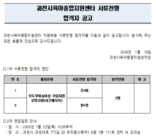 [] [과천시육아종합지원센터] 직원채용(운영요원) 1차 서류전형 결과 공고