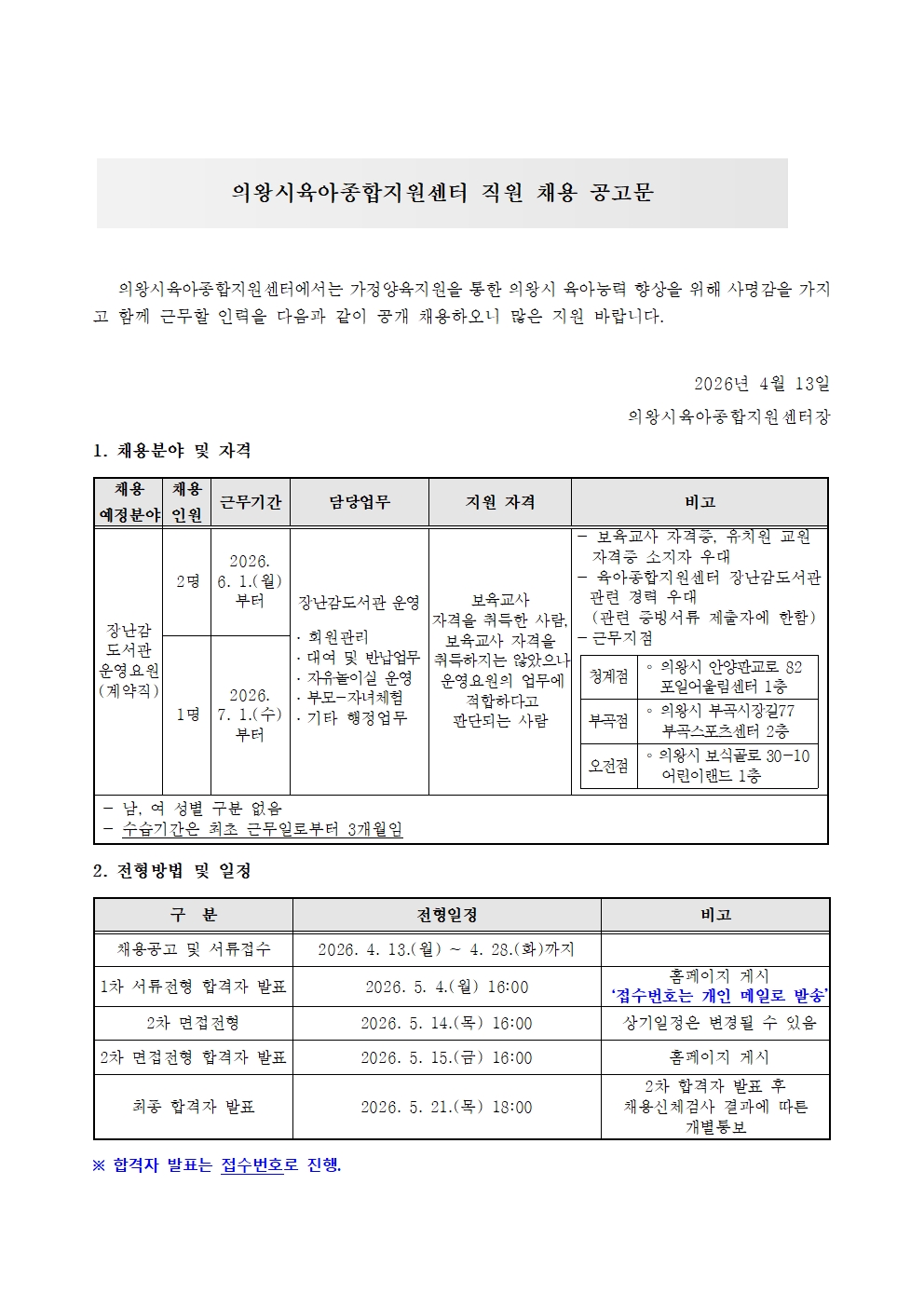 [] [의왕시육아종합지원센터] 직원 채용(운영요원)에 따른 홈페이지 공고