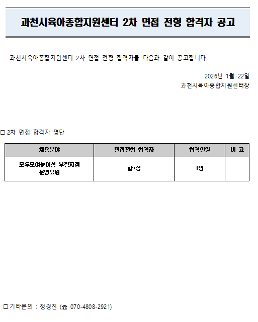 [] [과천시육아종합지원센터] 직원채용 2차 면접전형 합격자 공고(운영요원)