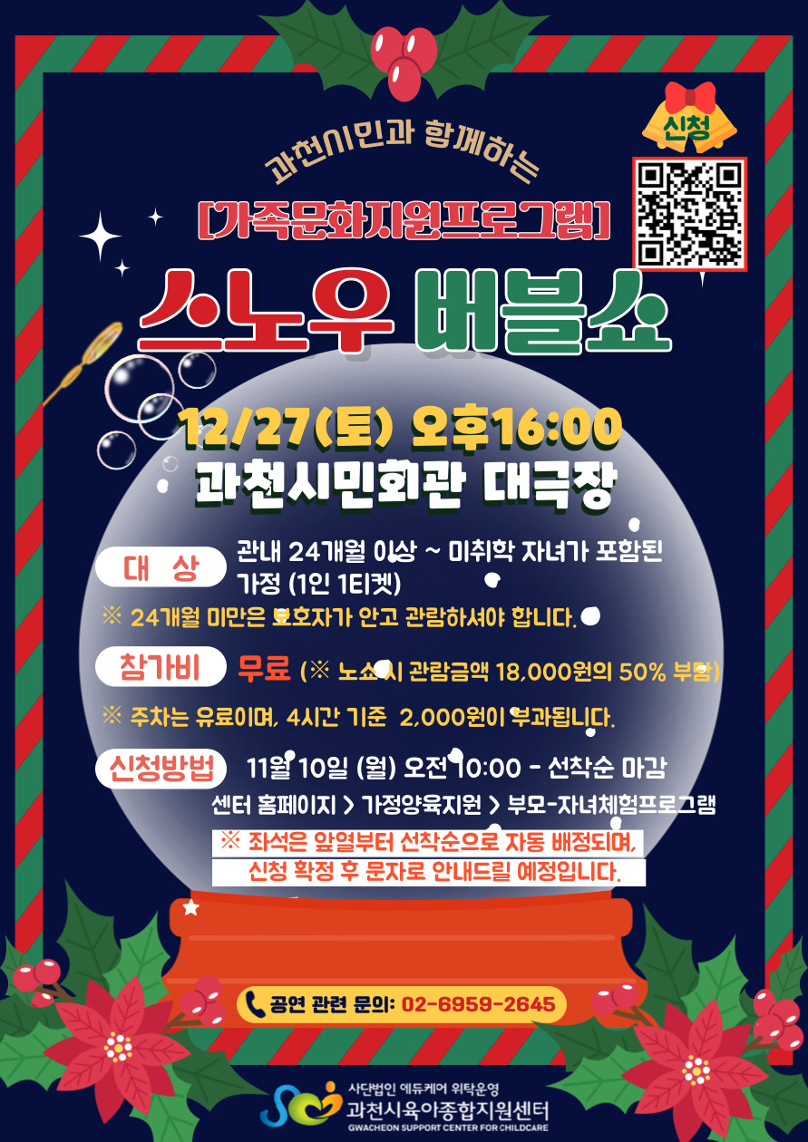 | ±âŸ»çÇ× | ¡á ½Åû ´ë»ó ¹× ±âÁØ - °úõ½Ã °ü³» 24°³¿ù ÀÌ»ó ~ ¹ÌÃëÇÐ Àڳడ Æ÷ÇÔµÈ °¡Á¤¸¸ ½Åû°¡´É ÇÕ´Ï´Ù. (* 24°³¿ù ¹Ì¸¸ ¿µ¾Æ´Â º¸È£ÀÚ ¹«¸ À§¿¡¼ °ü¶÷ °¡´ÉÇÕ´Ï´Ù.) - Áֹεî·Ïµîº»¿¡ µî·ÏµÈ Àڳุ Âü¿© °¡´ÉÇϸç, º¸È£ÀÚ´Â µîº» ¿Ü Àοøµµ Âü¿©ÇÒ ¼ö ÀÖ½À´Ï´Ù.(¡ØÃßÈÄ ³×À̹öÆû Á¦Ã⠽à µîº» ÷ºÎ Çʼö) (*°ü³» °ÅÁÖÀÚ°¡ ¾Æ´Ò °æ¿ì, Á¶ºÎ¸ð °¡Á·°ü°èÁõ¸í¼ ¶Ç´Â °ü³» ÀçÁ÷Áõ¸í¼ Áß 1ºÎ¸¦ Ãß°¡ ÷ºÎÇØ ÁÖ¼¼¿ä.) - ȨÆäÀÌÁö ½ÅûÀº ¼¾ÅÍ È¨ÆäÀÌÁö¿¡ µî·ÏµÈ ÀÚ³à Àοø ±âÁØÀ¸·Î ¿ì¼± ½ÅÃ»ÇØ ÁÖ¼¼¿ä. ÀÌÈÄ ³×À̹öÆûÀ» ÅëÇÑ µ¿ÀǼ Á¦Ãâ ½Ã, ½ÇÁ¦ Âü¿© Àοø ¹× ¸í´ÜÀ» Á¤È®È÷ ±âÀçÇØÁֽñ⠹ٶø´Ï´Ù. - 24°³¿ù ÀÌ»ó ¾Æµ¿Àº Á¼®ÀÌ ¹Ýµå½Ã ÇÊ¿äÇÏ¿© Á¼® ¼ö¿¡ Æ÷ÇԵǸç, 24°³¿ù ¹Ì¸¸ ¿µ¾Æ´Â º¸È£ÀÚ ¹«¸ À§¿¡¼ °ü¶÷ÇϹǷΠµ¿Çà º¸È£ÀÚ 1ÀÎ Àοø¿¡ Æ÷ÇԵ˴ϴÙ. (*¿¹: ¾Æºü 1ÀÎ, ¾ö¸¶ 1ÀÎ, 4¼¼ ù°¾Æ, 23°³¿ù µÑ°¾Æ ¡æ ÃÑ ½Åû Àοø 3¸í) ¡á ½Åû ¹× µ¿ÀǼ Á¦Ãâ - ȨÆäÀÌÁö ½Åû ¿Ï·á ÈÄ ³×À̹öÆû µ¿ÀǼ ÀÛ¼º±îÁö ¸ðµÎ ¿Ï·áÇØ¾ß ½ÅûÀÌ ÃÖÁ¾ È®Á¤µË´Ï´Ù. - ȨÆäÀÌÁö ½Åû ¼øÀ¸·Î Á¼®ÀÌ ¹èÄ¡µÇ¸ç ¿ì¼±¼øÀ§°¡ ºÎ¿©µË´Ï´Ù. - ³×À̹öÆû ¸µÅ©´Â ¾Æ·¡ ÀÏÁ¤¿¡ ¸ÂÃç ¹ß¼ÛµË´Ï´Ù. ¡¤ 1Â÷(~11/21) ½ÅûÀÚ: 11/21(±Ý) ¹ß¼Û ¿¹Á¤ ¡¤ 2Â÷(~12/5) ½ÅûÀÚ: 12/5(±Ý) ¹ß¼Û ¿¹Á¤ ¡¤ 3Â÷(~12/19) ½ÅûÀÚ: 12/19(±Ý) ¹ß¼Û ¿¹Á¤ (*³×À̹öÆû ¹ÌÁ¦Ãâ ¶Ç´Â Áö¿¬ ½Ã, ½Åû È®Á¤ ¹× Á¼® ¹èÁ¤ÀÌ ¾î·Á¿ï ¼ö ÀÖ½À´Ï´Ù.) ¡á Âü°¡ÀÚ À¯ÀÇ»çÇ× - °³º° À̵¿À¸·Î Âü¿©Çϸç, °ø¿¬ ½ÃÀÛ 30ºÐ Àü±îÁö µµÂøÇÏ¿© ´ã´çÀÚ¿¡°Ô Ãâ¼® È®ÀÎ ÈÄ ÀÔÀåÇÕ´Ï´Ù. - ¿øÈ°ÇÑ °ø¿¬ °ü¶÷À» À§ÇØ °ø¿¬ ½ÃÀÛ 10ºÐ Àü±îÁö Âø¼®ÇØ Áֽðí, ¾È³»¿øÀÇ ¾È³»¿¡ µû¶ó ÀÔÀåÇØ ÁÖ¼¼¿ä.- Á¼®Àº ¾Õ¿ºÎÅÍ ¼±Âø¼øÀ¸·Î ÀÚµ¿ ¹èÁ¤µÇ¸ç, ½Åû È®Á¤ ÈÄ ¹®ÀÚ·Î Á¼® Á¤º¸¸¦ ¾È³»µå¸³´Ï´Ù. - ÀÔÀå ½Ã ¹®ÀÚ·Î ¹ÞÀº Á¼® Á¤º¸¸¦ Á÷¿ø¿¡°Ô Á¦½ÃÇØ ÁÖ¼¼¿ä. - °ø¿¬ÀåÀº ÁöÁ¤Á¼®Á¦·Î ¿î¿µµÇ¸ç, Á¼® À̵¿Àº ºÒ°¡ÇÕ´Ï´Ù. ¡á ³ë¼î ¹× ºñ¿ë °ü·Ã ¾È³» - ÇØ´ç °ø¿¬ÀÇ 3ȸÂ÷(16:00)´Â °úõ½ÃÀ°¾ÆÁ¾ÇÕÁö¿ø¼¾ÅÍ ´Üµ¶ ´ë°üÀ¸·Î ÁøÇàµË´Ï´Ù. - ³ë¼î ¹ß»ý ½Ã¿¡µµ ¿¹»êÀÌ ÁýÇàµÇ´Â °ü°è·Î ´çÀÏ ¹«´Ü ºÒÂü ½Ã °ø¿¬ °ü¶÷·áÀÇ 50%¸¦ ºÎ´ãÇÏ°Ô µË´Ï´Ù. (*¿¹: ½Åû Àοø ÃÑ 4¸íÀÏ °æ¿ì ¡æ °ø¿¬ °ü¶÷·á 1ÀÎ 18,000¿øÀÇ 50%ÀÎ 9,000¿ø x 4¸í = ÃÑ 36,000¿ø ºÎ´ã) ¡Ø ½Åû Ãë¼Ò´Â °ø¿¬ 3ÀÏ Àü±îÁö¸¸ °¡´ÉÇÏ¸ç ²À À¯¼±À¸·Î ¿¬¶ôÁֽñ⸦ ºÎʵ右´Ï´Ù. ¡Ø ÁÖÂ÷´Â À¯·áÀ̸ç, 4½Ã°£ ±âÁØ 2,000¿øÀÌ ºÎ°úµË´Ï´Ù. ¡á Ãë¼Ò ¹× ȯºÒ ±ÔÁ¤ - ½Åû ÈÄ Ãë¼Ò´Â °ø¿¬ 3ÀÏ Àü(12/24)±îÁö¸¸ °¡´ÉÇÏ¸ç ²À À¯¼±À¸·Î ¿¬¶ôÁֽñ⸦ ºÎʵ右´Ï´Ù. - °³ÀÎ »çÁ¤¿¡ ÀÇÇÑ ´çÀÏ Ãë¼Ò´Â ºÒ°¡´ÉÇÕ´Ï´Ù. (³ë¼î ±Ý¾× ºÎ´ã) ¡á °ø¿¬Àå ¿¡Æ¼ÄÏ - °ø¿¬Àå ³» À½½Ä¹° ¹ÝÀÔ ¹× ¼·Ãë´Â ºÒ°¡ÇÕ´Ï´Ù. - °ø¿¬ Áß¿¡´Â »çÁø ¹× ¿µ»ó ÃÔ¿µÀÌ Çã¿ëµÇÁö ¾Ê½À´Ï´Ù. |