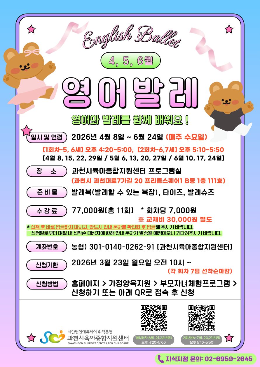 * [지식] 2026년 4~6월 영어발레(2회차-6~7세: 17:10~17:50)는 6~7세 유아가 양육자 없이 참여하는 프로그램입니다. (※2020, 2021년생)