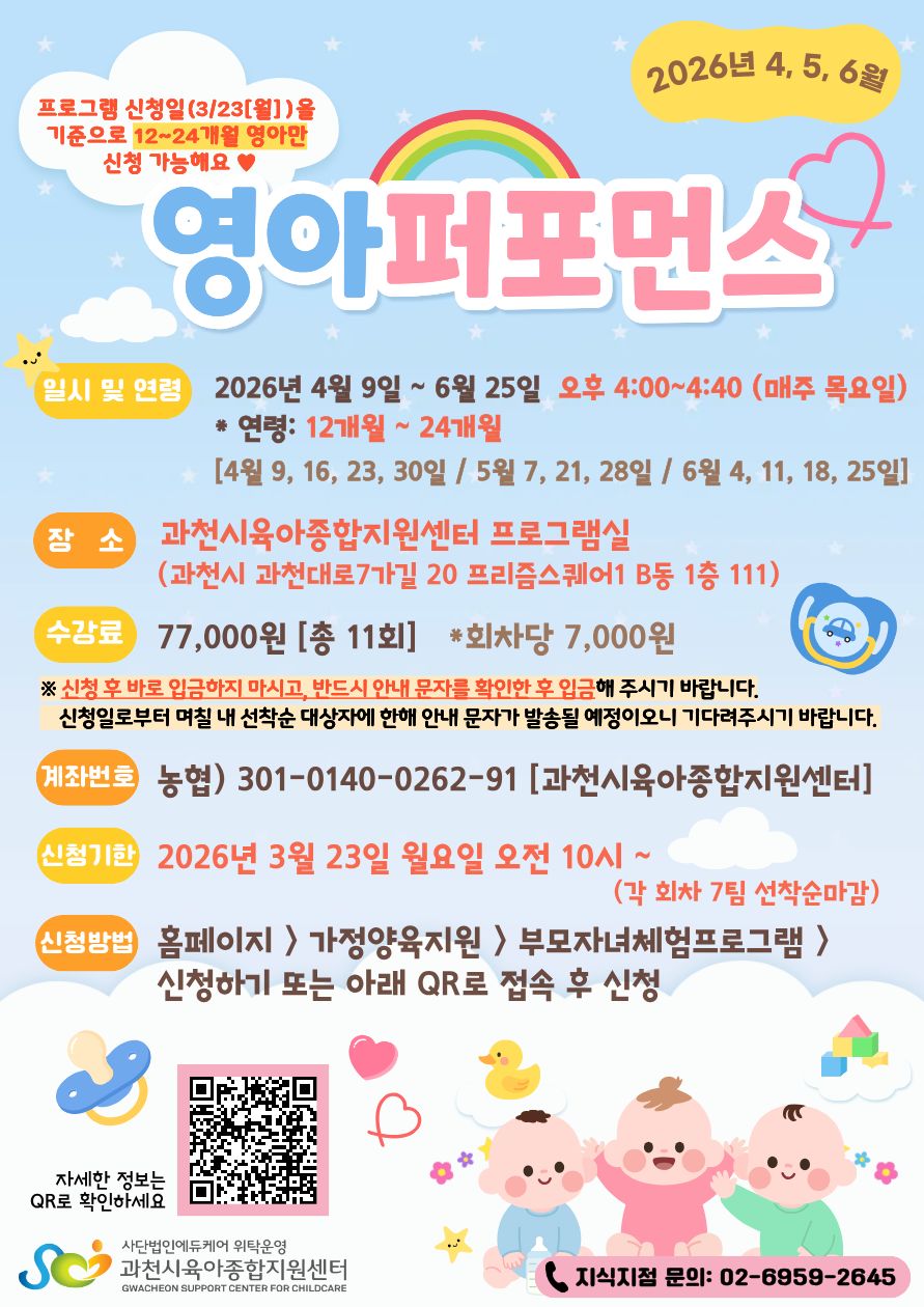 * [지식] 2026년 4~6월 영아퍼포먼스(12~24개월: 16:00~16:40)는 12~24개월 영아와 양육자가 한 팀으로 참여하는 영아 오감체험 프로그램입니다. (※프로그램 신청일인 3/23[월]을 기준으로 12~24개월 영아만 신청 가능)